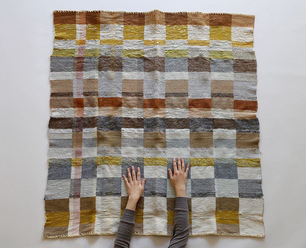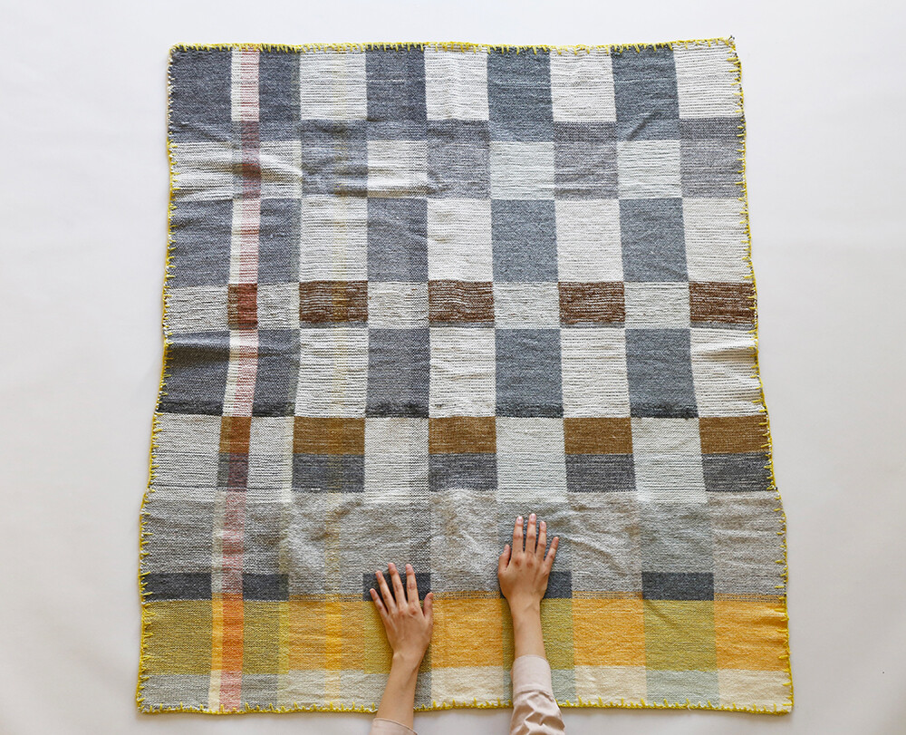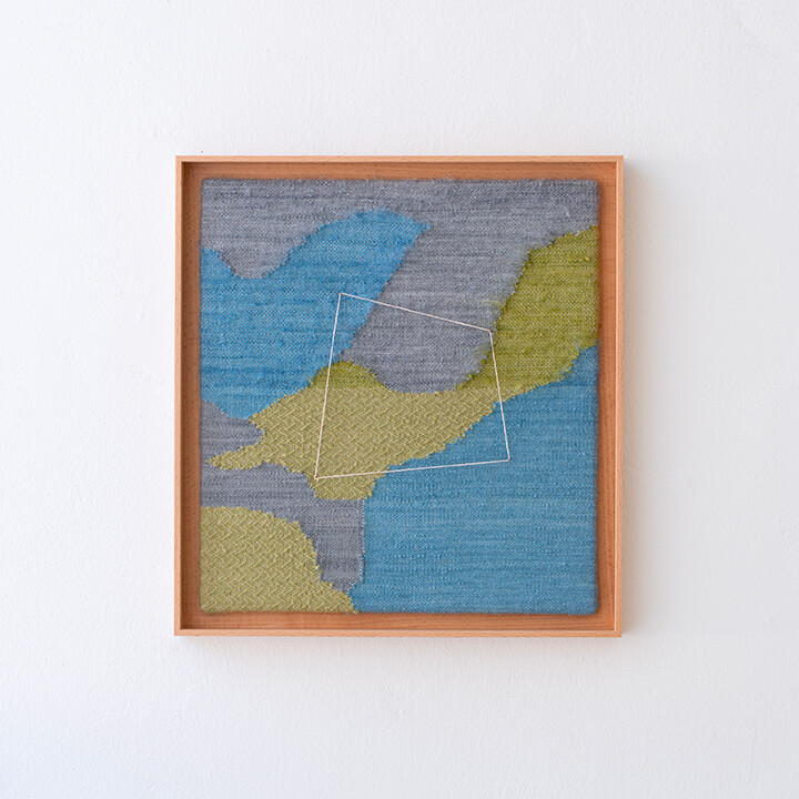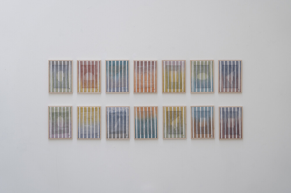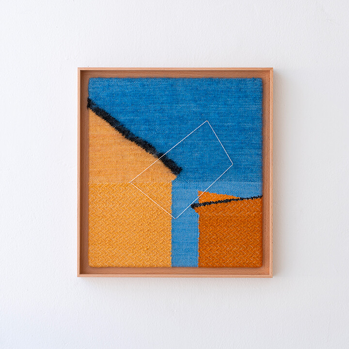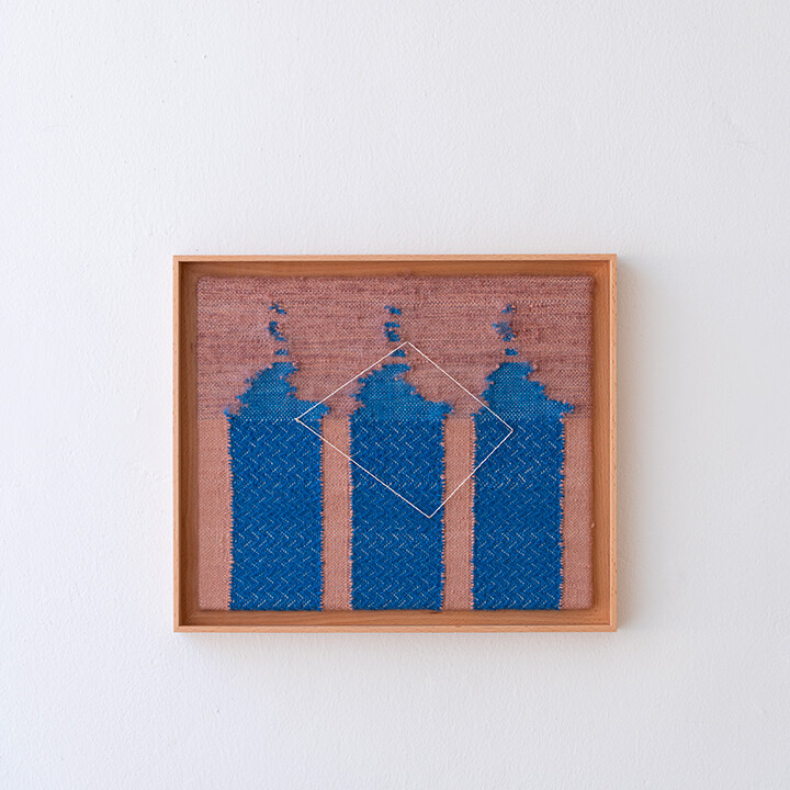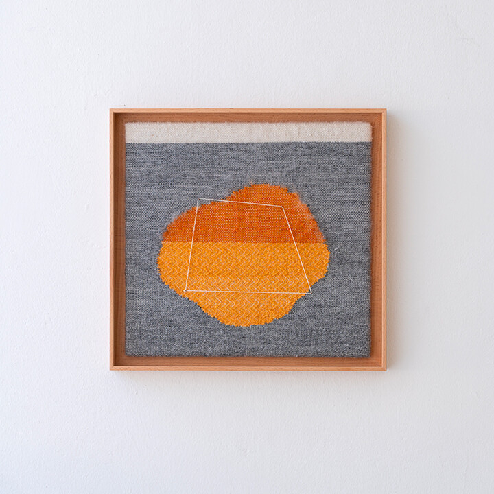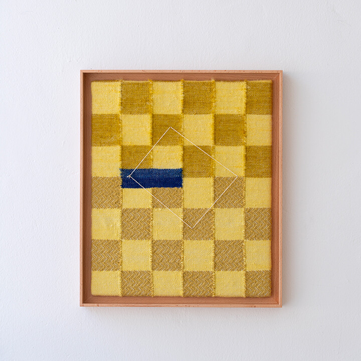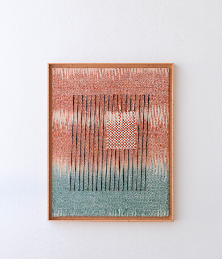 Tint of Time은 작가가 스톡홀름에서 생활하며 몇 년간 느낀 계절과 장소의 색을 개인적인 경험으로 담아낸 작품들이다. 흐릿하게 번지는 색감으로 날실을 염색(ikat 기법)하여, 빛, 공기와 같은 감각들이 시간 속에서 사라지거나, 옅어지거나, 조용히 남는 기억의 흐름을 표현하고자 했다. 이중 직조 구조는 다양한 직사각형 형태를 담고 있으며, 이는 도시의 리듬과 고요한 기하학을 반영한다. 비스듬히 걸린 실선들은 찰나의 인상을 시각적으로 고정시키는 닻처럼 작용하며, 그 순간들을 조용히 붙잡아둔다. 완성된 직조 면 위에 고정된 못 사이로 실을 비스듬히 걸어 그려낸 섬세한 제스처들이 더해졌다.