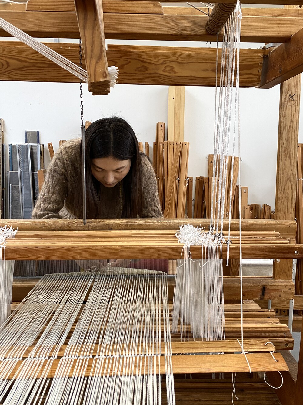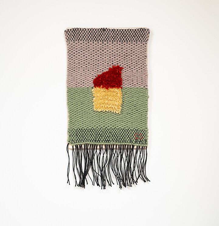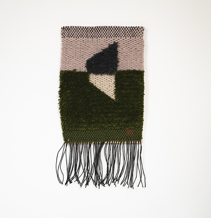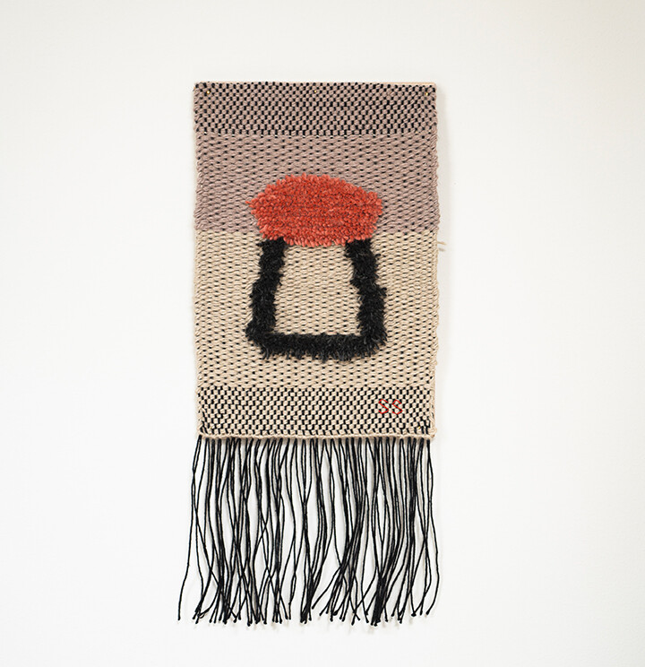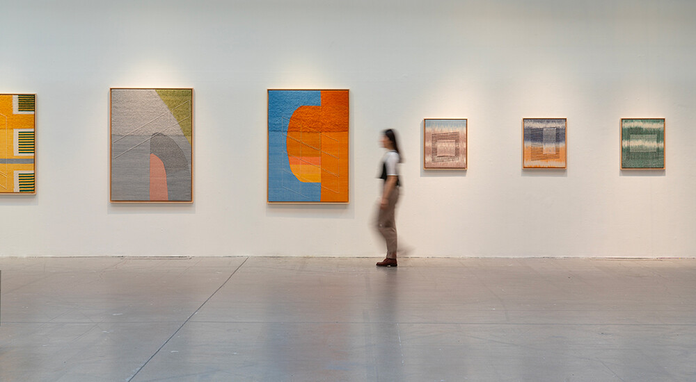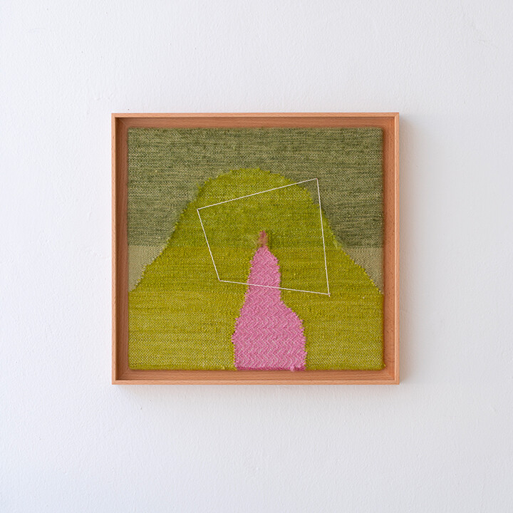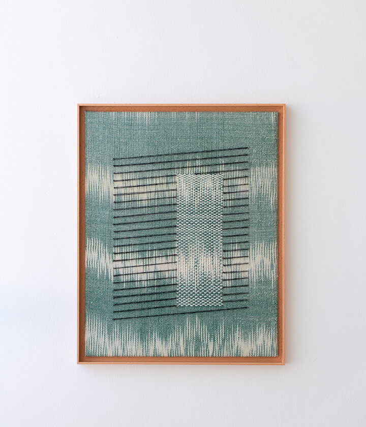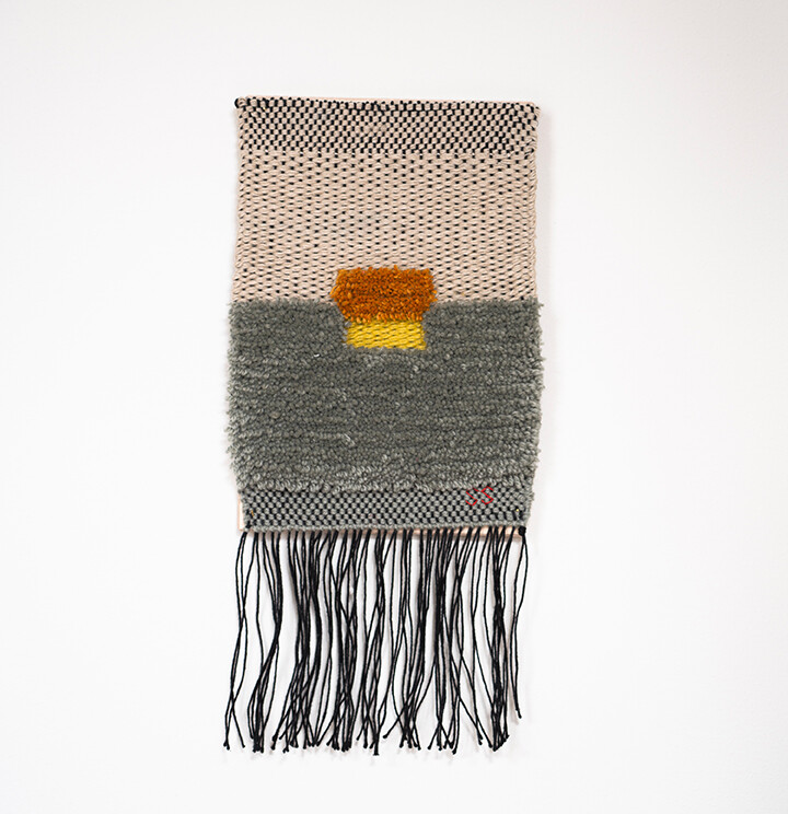 Tint of Time은 작가가 스톡홀름에서 생활하며 몇 년간 느낀 계절과 장소의 색을 개인적인 경험으로 담아낸 작품들이다. 흐릿하게 번지는 색감으로 날실을 염색(ikat 기법)하여, 빛, 공기와 같은 감각들이 시간 속에서 사라지거나, 옅어지거나, 조용히 남는 기억의 흐름을 표현하고자 했다. 이중 직조 구조는 다양한 직사각형 형태를 담고 있으며, 이는 도시의 리듬과 고요한 기하학을 반영한다. 비스듬히 걸린 실선들은 찰나의 인상을 시각적으로 고정시키는 닻처럼 작용하며, 그 순간들을 조용히 붙잡아둔다. 완성된 직조 면 위에 고정된 못 사이로 실을 비스듬히 걸어 그려낸 섬세한 제스처들이 더해졌다.